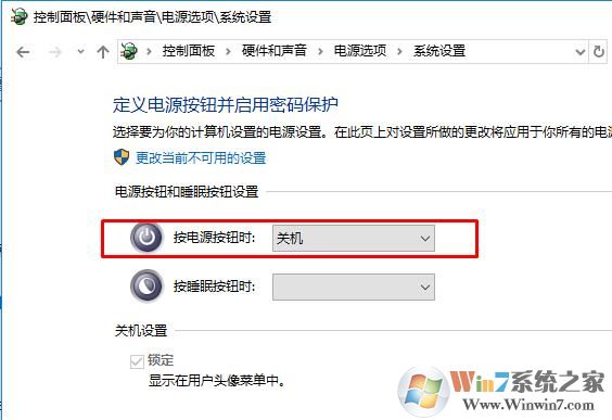 3、我们可以将“用电池”和“接通电源”下的“按电源按钮时”,下拉菜单都选择“关机”,选择好之后点击【保存】;