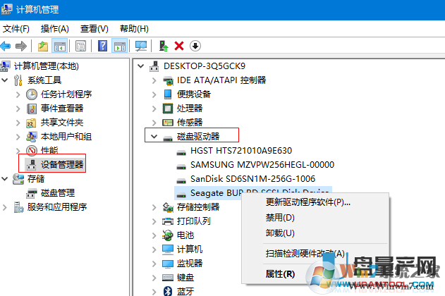 第一步,进入”计算机管理-设备管理-磁盘驱动器” ,选择你要设置的硬盘,右键属性