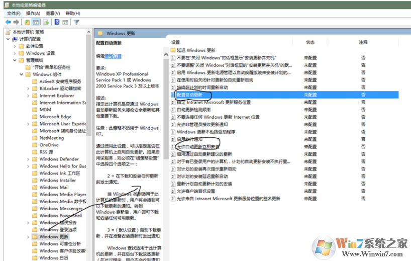 3、再Windows更新中找到配置自动更新和允许自动更新继续安装选项,全部选择为禁用即可。