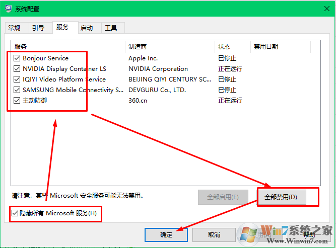2、转到服务,选择隐藏所有Microsoft服务,然后禁用全部。