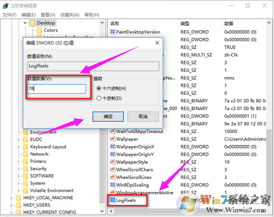 3、找到LogPixels(如果没有就新建一个“DWORD (32位)值”,命名为LogPixels),将LogPixels修改为所需放大的百分比数值,注意十六进制与十进制的转换(括号内为十进制的放大百分比,括号外为十六进制的放大数值,例如想放大到120%,就填写78):78(120%),7D(125%),96(150%),C8(200%)。