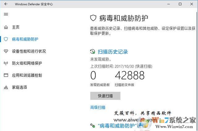 1\在Win10任务栏Cortana小娜搜索框中输入 Windows Defender ,然后点击搜索结果中的“Windows Defender安全中心”打开《Windows Defender安全中心》应用,进入“病毒和威胁防护”设置界面。如图: