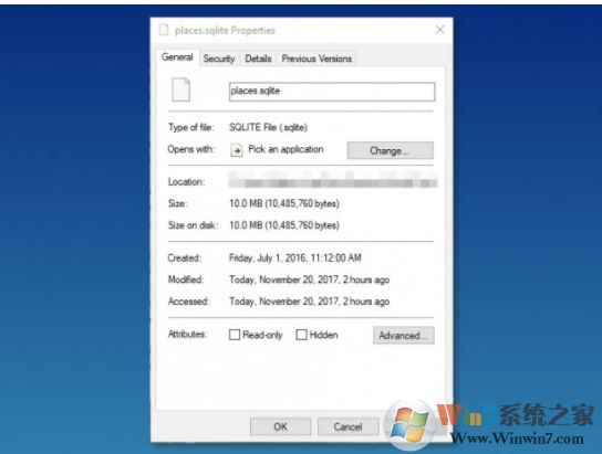 5、该places.sqlite属性窗口出现。从“ 属性”部分的“ 只读”选项中除去复选框。