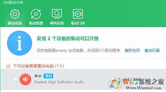 4、检测完毕后将需要更新的声卡、显卡驱动更新一遍,完成更新后重启win10电脑即可解决问题!