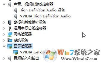2、打开设备管理器分别展开【声音、视频和游戏控制器 】和【显示适配器】、【音频输入和输出】查看是否有 ↓ 的箭头,若有的话在对应设备上单击右键,选择【启用】;