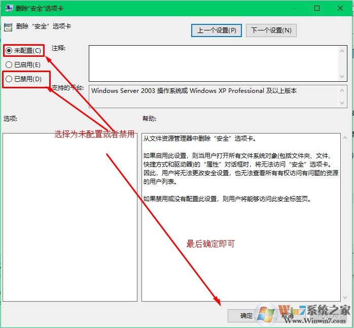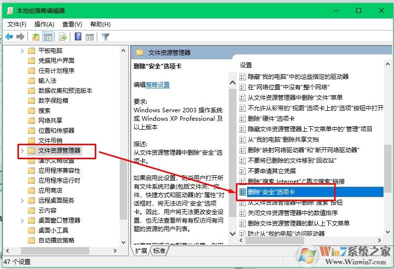 2、找到:用户配置-管理模板-Windows组件-文件资源管理器,查看右侧的位置如下图,找到删除安全选项卡,查看状态是否是未配置。如果不是,请改为“未配置”。