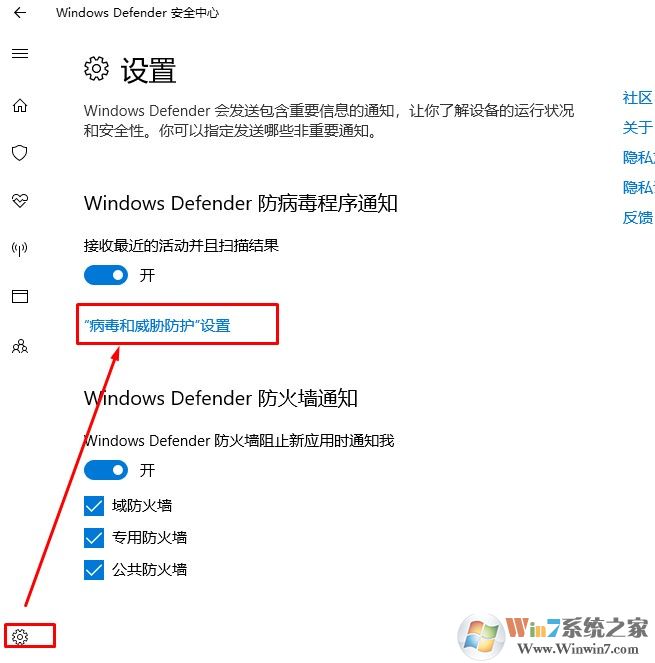 2、选择左下角设置,选择“病毒和防护威胁设置”。