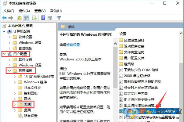 2、在组策略左侧依次双击打开:用户配置→管理模板→系统,在右侧双击打开“不要运行指定的Windows应用程序” ;
