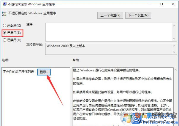6、切换到组策略中的不要运行指定的Windows应用程序,点击【已启用】,然后点击下面的【显示】,如图;