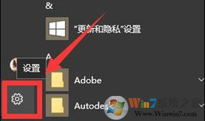 1、点击开始菜单。在开始菜单键上面有三个图标,分别是;用户。设置。电源。点击其中的设置按钮。