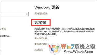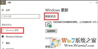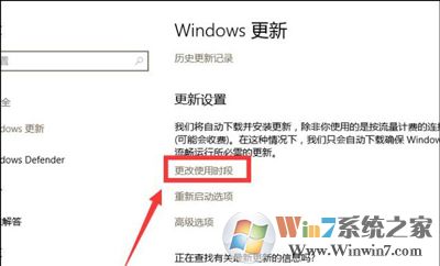 3、选择左侧列表中的“Windows更新”。在右侧界面显示的是更新状态。在更新设置中有“更改使用时段”、“重新启用选项”、“高级选项”。