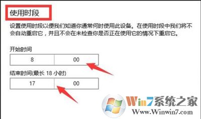 5、在使用时段中设置一下开始时间和结束时间。电脑将不会在这段时间进行重启更新,会在这以外的时间进行更新。