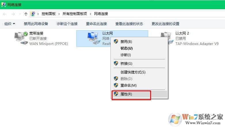4. 右键当前使用的网络连接(本地连接或宽带连接),选择“属性”。