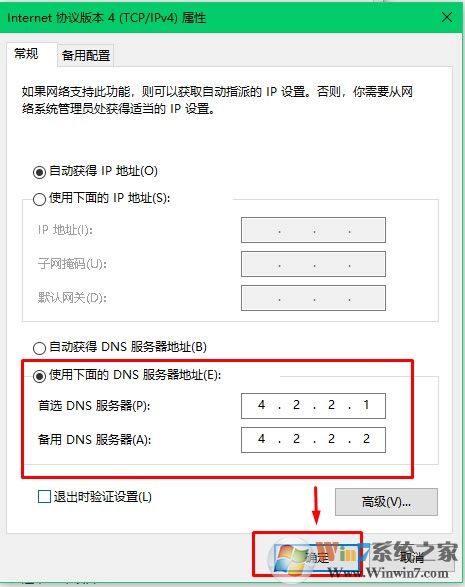 7. 在首选DNS服务器中输入:4.2.2.1,在备用DNS服务器中输入:4.2.2.2。然后确定即可。