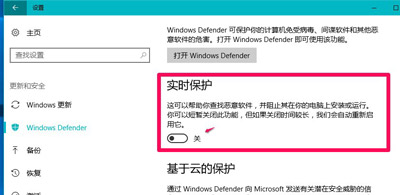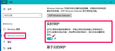 3、在更新和安全设置窗口,点击窗口左侧的Windows Defender,在其对应的右侧窗口中,我们看到【实时保护】的开关置于【开】的位置,点击将其开关置于【关】的位置;