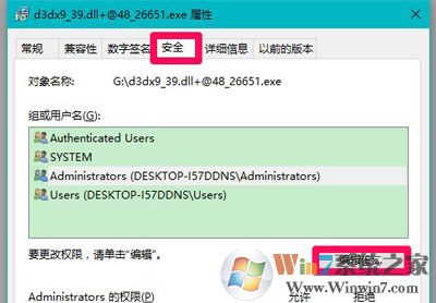 3、在d3dx9_39.dll+@48_26651.exe 属性窗口,点击【安全】- 【编辑】;