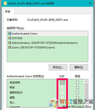 4、在d3dx9_39.dll+@48_26651.exe 权限窗口,我们把Authenticated Users的权限设置为完全控制(可以把其它几项也都设置为完全控制),再点击:应用 - 确定;