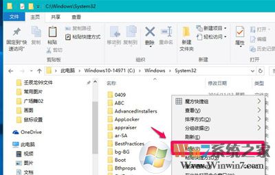 2、进入资源管理器,打开系统盘C:\Windows\System32,右键点击空白处,在右键菜单中点击:粘贴;