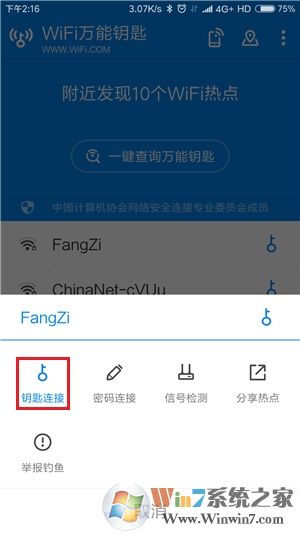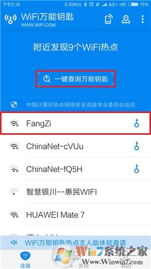 2.若此时手机没有通过热点连接到外网,则需要事先打开移动数据和WiFi功能。然后点击该软件“连接”界面中,最上方蓝色区域的“一键查询万能钥匙”按钮,此时软件会结合云端数据,搜索附近被其他用户分享过的热点,若找到对应的热点SSID名称后面会有一个蓝色的“钥匙”图标,然后需要点击信号最强的一个WiFi热点,接着点击“钥匙连接”按钮尝试快速连入,通常只需1-5秒钟的时间就能成功连上,如果是安装后第一次连接成功,还会弹出开启通知使用权的提示,为了避免自带的广告消息造成骚扰,此时建议点击“取消”按钮。