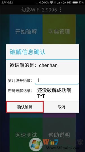 字典设置完成后即可开始暴破过程,返回程序主界面并点击“开始破解”,然后选择并点击一个信号最强的WiFi热点作为破解目标,接着在弹出的确认对话框中,点击“确认破解”按钮即可开始进行暴破操作。此时程序会依次采用字典文件中的每一行字符,作为WiFi密码并尝试连入该热点直到成功,如果已经指定了字典2文件,将在字典1中的所有字符,全部尝试结束后直接跳转。这个过程可能会很漫长,可以将手机插到充电器上慢慢等待。