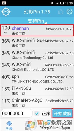 相关功能驱动文件被植入到系统中后,即可通过该软件实现暴破PIN码。打开幻影Pin软件后,在“列表”界面里的“支持Pin”一栏中,找到并点击选中信号最强的无线热点,然后直接点击右下角的“开始破解”按钮尝试进行破解操作。这个过程可能会很漫长,毕竟被破解的目标是8位数字,比不定长度的无线密码容易太多了,只需耐心等待一般都能成功。