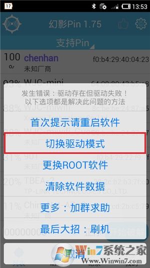 注意:1.运行该软件后若提示缺少驱动文件,请检查是否已将“wpa_cli”文件移动到“/system/bin/”目录下并赋予755权限,或把另外一个备用文件重命名后将其替换并重新赋权,亦可换一台设备或重新刷机后再尝试。