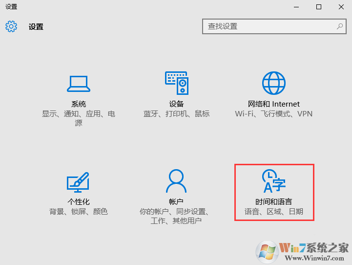 1、首先打开win10专业版中的设置,点击时间和语言标签。