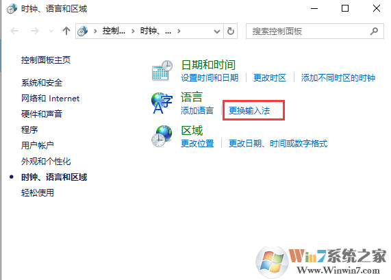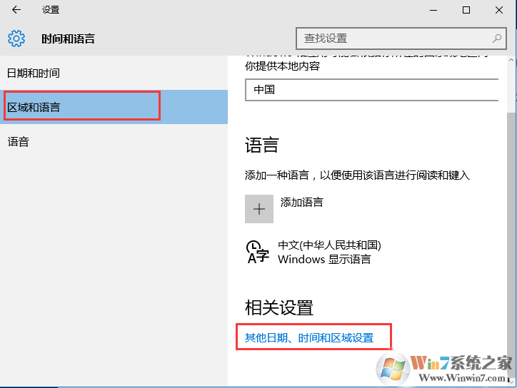 2、在时间和语言中点击区域和语言,点击其他日期、时间和区域设置。