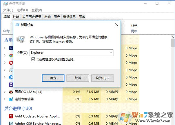 5、此时召唤出等候多时的任务管理器(如果刚才没打开,可按Ctrl+Shift+Del,点击任务管理器),点击文件→运行新任务,输入Explorer后点击“确定”运行即可(管理员权限可不勾选),如下图。
