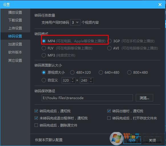 3、在转码中设置要转换的视频格式,MP4格式可以在电脑和手机中播放;