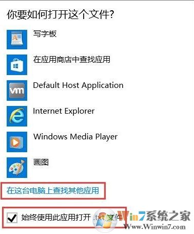 2、点击“更多应用”,下拉到最下面,勾选“始终使用此应用打开.txt文件”,然后点击“在这台电脑上查找其他应用”,如图所示: