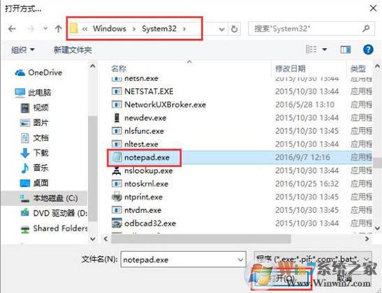 3、如是64位系统,打开C:Windows\SysWOW64文件夹,32位系统打开C:Windows\system32,找到并选中“notepad.exe”,点击打开,之后就可以打开TXT文本文档了。如图所示:
