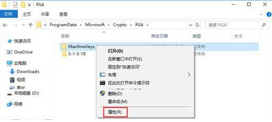 2、删除之后然后打开C:\ProgramData\Microsoft\Crypto\RSA\MachineKeys文件夹,在MachineKeys 文件夹上单击右键,选择【属性】;