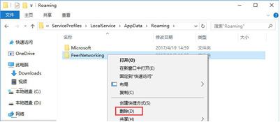 1、打开此电脑,依次展开:C:\Windows\ServiceProfiles\LocalService\AppData\Roaming\PeerNetworking ,将“PeerNetworking”文件夹删除,删除之前最好先备份一下;