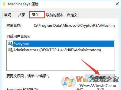 3、在MachineKeys 属性界面,点击【安全】选卡,在下面点击【编辑】按钮,如图: