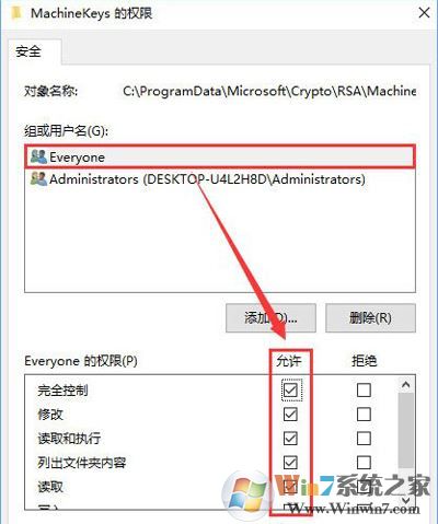 4、在MachineKeys 的权限界面,组合用户名框中选中“Everyone”,在下面Everyone的权限框中将所有选项勾选“允许”,点击【确定】 --【确定】保存设置;