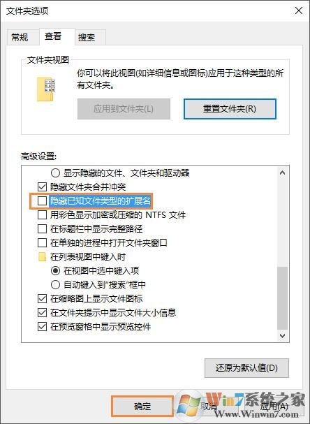 4、不要√勾选“隐藏已知文件类型的扩展名,在单击”确定“。