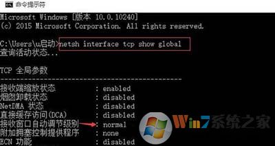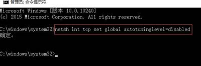 4、接着输入命令:netsh int tcp set global autotuninglevel=disabled回车,系统会收到确认消息,窗口自动调节级别便会关闭。如图: