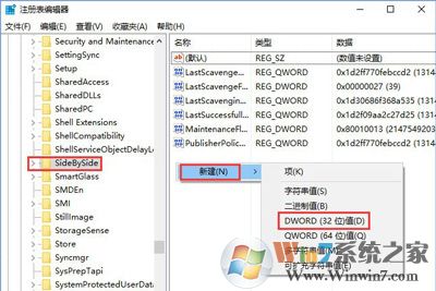 2、在注册表左侧依次展开:HKEY_LOCAL_MACHINE/SOFTWARE/Microsoft/Windows/CurrentVersion/SideBySide,在右侧单击右键点击【新建】-【DWORD(32位)值】,将改制命名为【 PreferExternalManifest】。