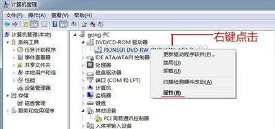 3、在右侧窗口找到DVD/CD-ROM驱动器,并右键点击,在下拉菜单中选择属性。