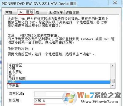 4、我们在打开的属性窗口点击:DVD区域,在地理区域窗口下拉滑块,点击区域为“中国”(有次数限制),再点击:确定。