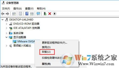 2、打开的设备管理器窗口中,展开“显示适配器”,在下面显卡上点击右键,选择“卸载”,如下图所示: