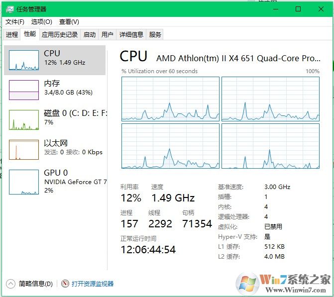 性能界面下,我们可以看见详细的硬件使用情况,可以用以判断自己的系统硬件是否使用正常和是否需要升级该硬件。具体判断数值大家可自行百度。