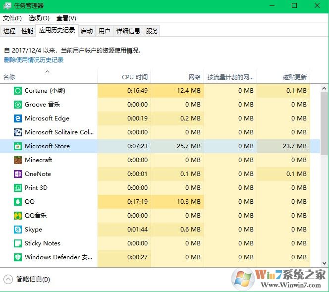 在应用历史记录下,我们可以看到所有软件在本次启动中对cpu和网卡流量的使用情况。这一点对于节能和使用移动网卡的用户非常的有用。对于流量非常大的软件我们提前将其结束即可。