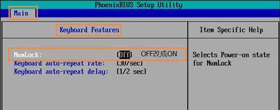 1、刚开机时按 Del 键进入 BIOS 设置,再进到 Advanced BIOS Features 项中;或者 Main → Keyboard Features 项。