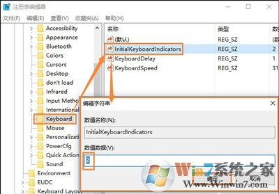 3、进入开始菜单,点运行,输入 regedit 点确定,打开注册表编辑器,找到 HKEY_CURRENT_USER\Control Panel\Keyboard 项,将其中的 InitialKeyboardIndicators 数值改为 2 。重新启动就可以看到 NumLock 灯自动亮起了。