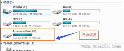 3、修复完成之后“我的电脑”也正常显示磁盘空间,双击正常启动。