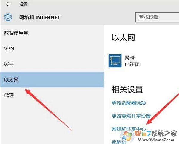 3、然胡选择以太网,然后在右边选择网络和共享中心,