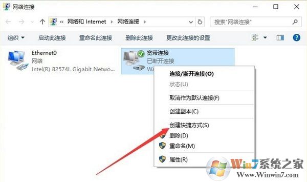 3、然后在宽带链接的图标上右击,选择创建快捷方式,