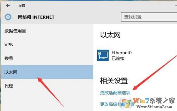 2、进入网络和Internet界面,选择左边的以太网,然后在右边选择更改适配器选项,